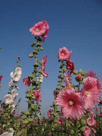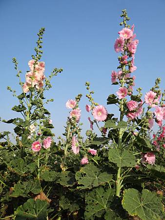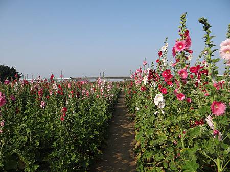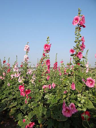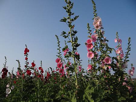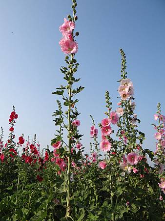 高高低低的蜀葵花,花田分成幾個縱列,有的高有的低~顏色大約有四種