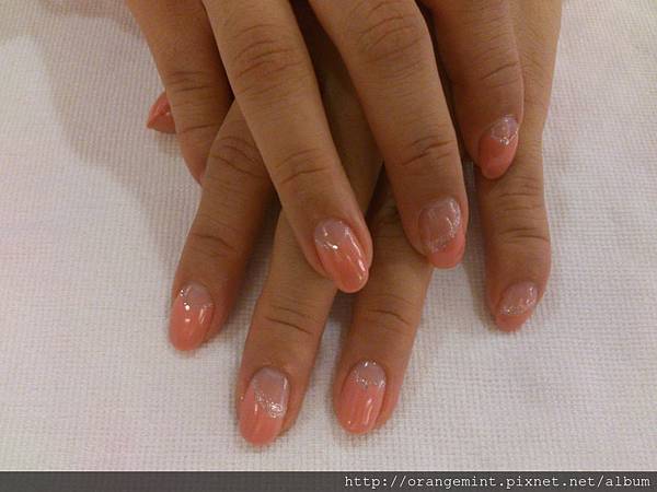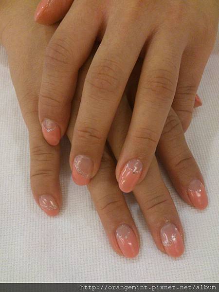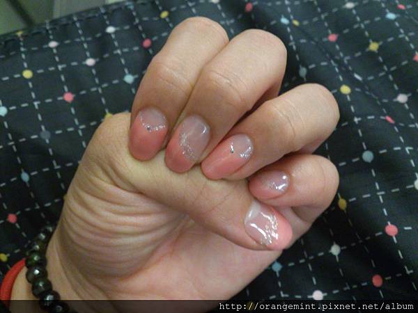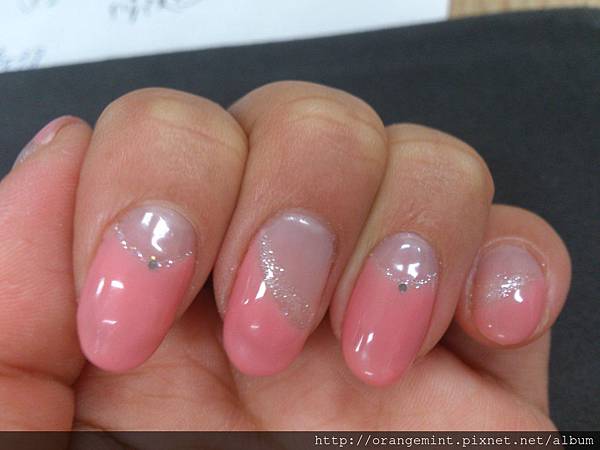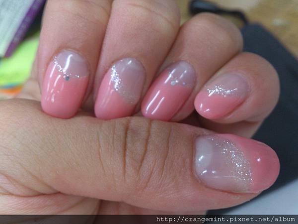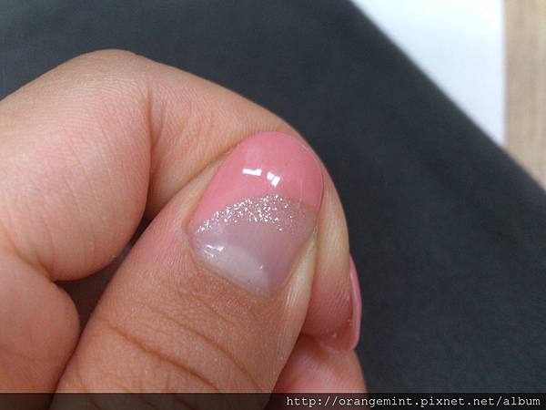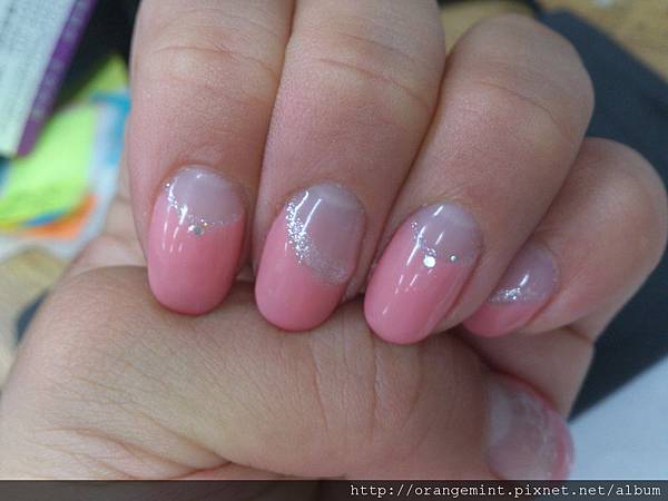 挑了看起來比較安全稍稍偏橘的粉紅色跟珍珠白的亮片色