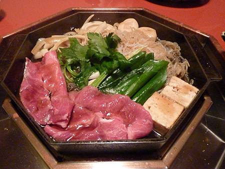 菜盤裡有洋蔥、豆腐、磨菇、蒟蒻、青菜,還有超級少的幾片牛肉